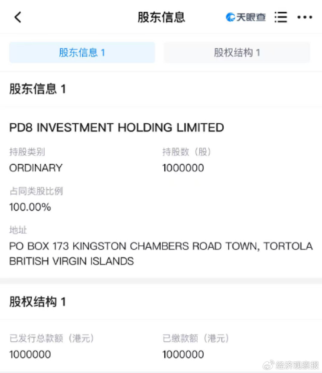其后,记者通过天眼查平台查询得知,一家名为PD8 INVESTMENT HOLDING LIMITED的公司全资控股鹏海控股,其注册地址为PO BOX 173 KINGSTON CHAMBERS ROAD TOWN, TORTOLA BRITISH VIRGIN ISLANDS(英属维尔京群岛托托拉岛金斯顿钱伯斯路镇邮政信箱173号)。